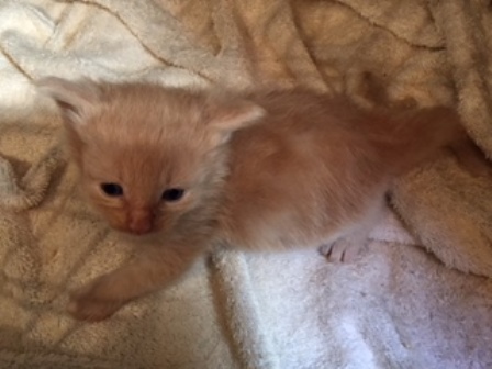 Pendant ce temps, les 6 petits coquins ont lentement mais sûrement pris du poids (je les pèse tous les deux jours) et le 27 août, ils ont ouvert les yeux pour la première fois.C’était une expérience magnifique ! Aujourd’hui, le 7 septembre, ils vont bien et sont déjà très animés, sauf le petit chaton de couleur crème qui a du mal à prendre du poids. Je lui donne depuis quelques jours 2 à 3 fois par jour le biberon et nous deux sommes assis là à regarder les autres dans le nid alors qu’ils se livrent déjà leurs petites « batailles de chatons ».